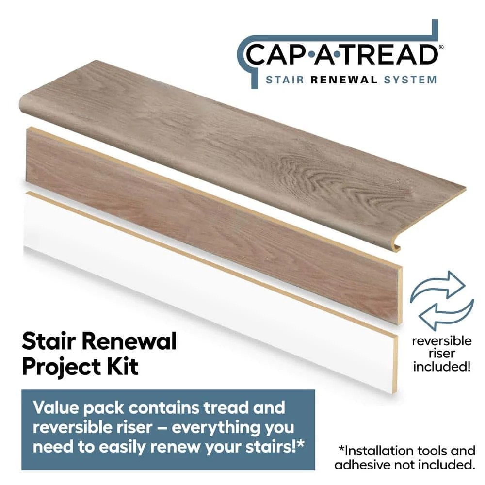 - New; stair renewal project kit – value pack contains tread and reversible riser – everything you need to easily renew your stairs; kit includes 1 tread and 1 reversible riser; installation tools and adhesive not included