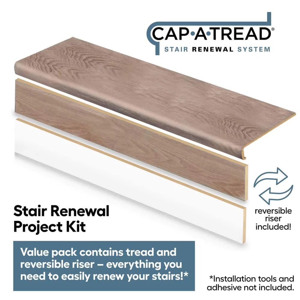 - New; stair renewal project kit – value pack contains tread and reversible riser – everything you need to easily renew your stairs; kit includes 1 tread and 1 reversible riser; installation tools and adhesive not included