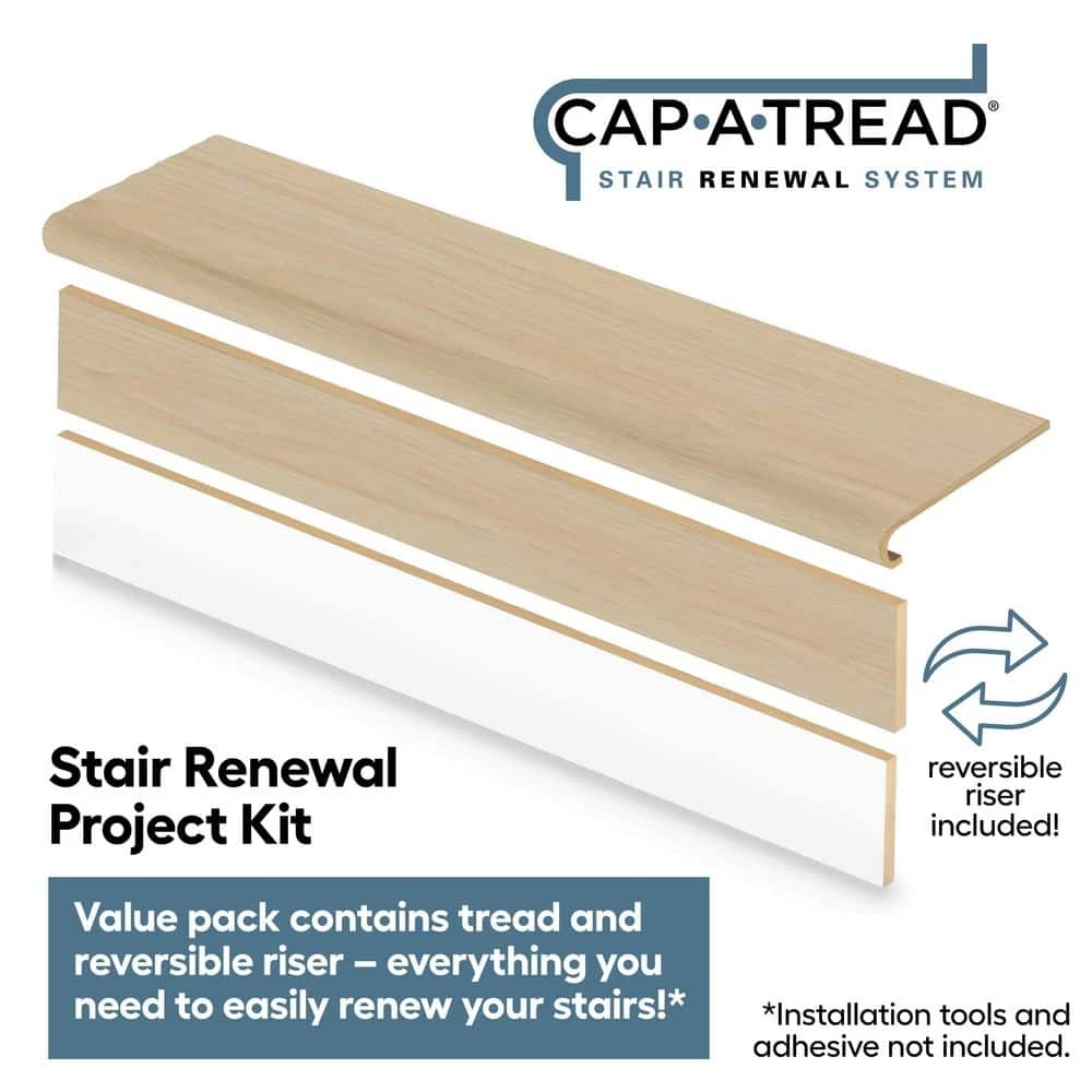 - New; stair renewal project kit – value pack contains tread and reversible riser – everything you need to easily renew your stairs; kit includes 1 tread and 1 reversible riser; choose to install for white or matching color riser look; installation tools and adhesive not included