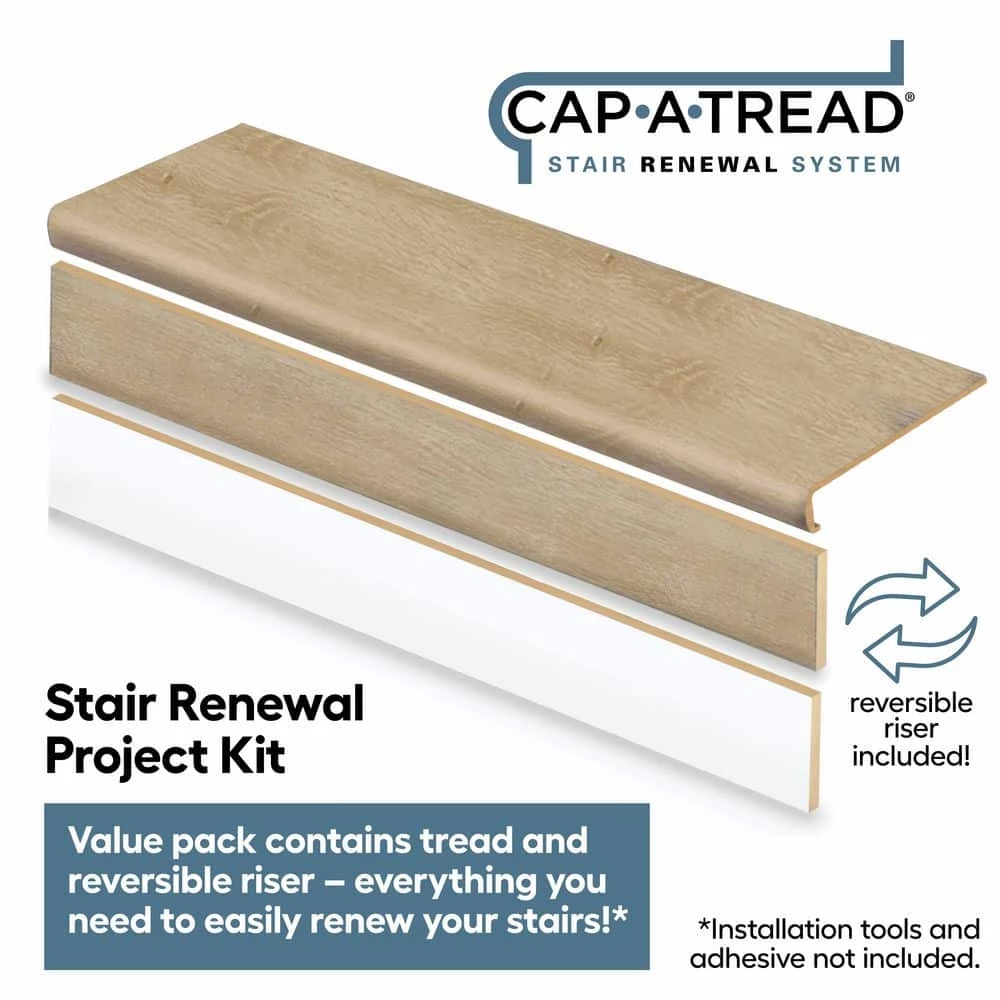 - New; stair renewal project kit – value pack contains tread and reversible riser – everything you need to easily renew your stairs; kit includes 1 tread and 1 reversible riser; installation tools and adhesive not included
