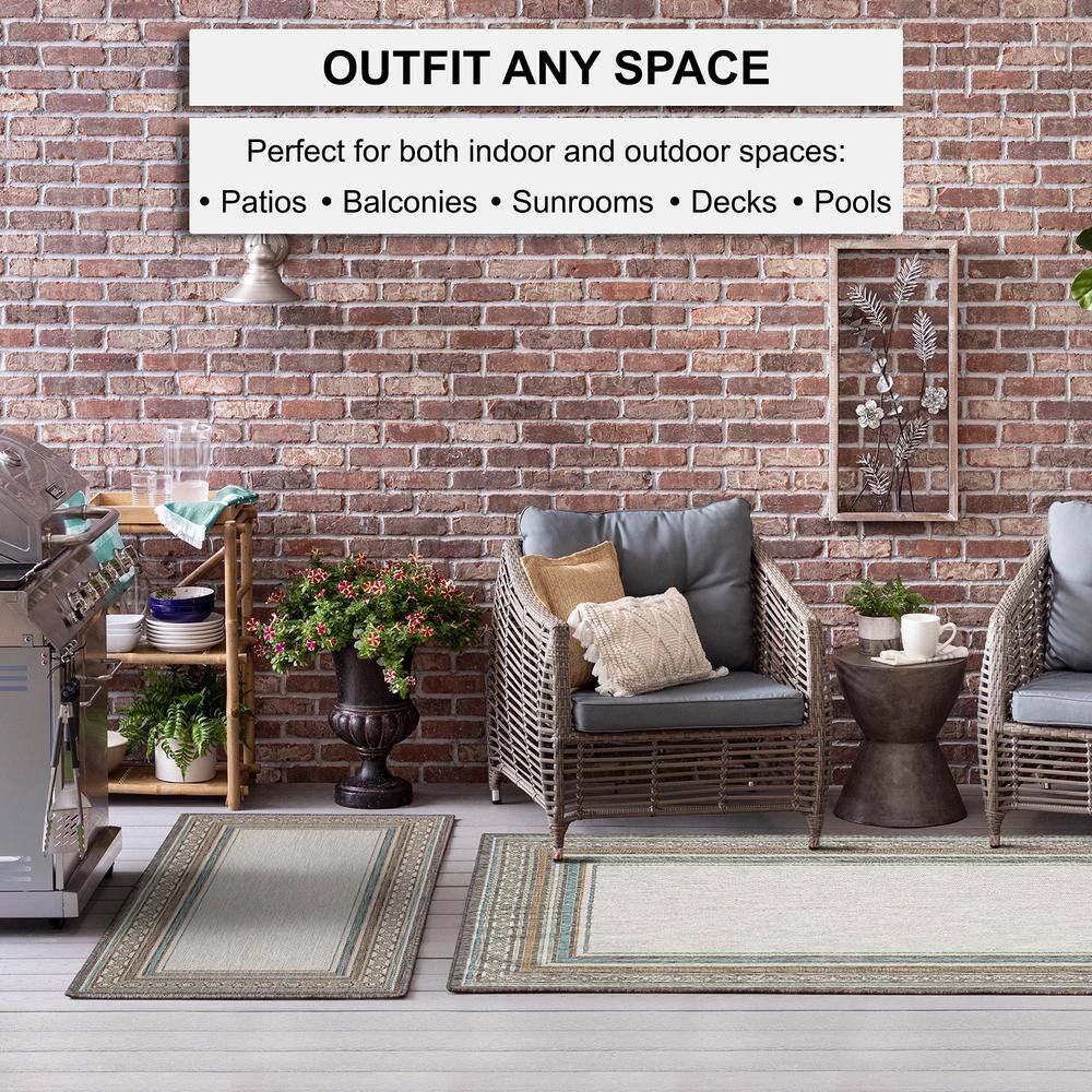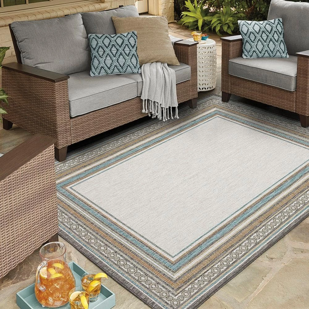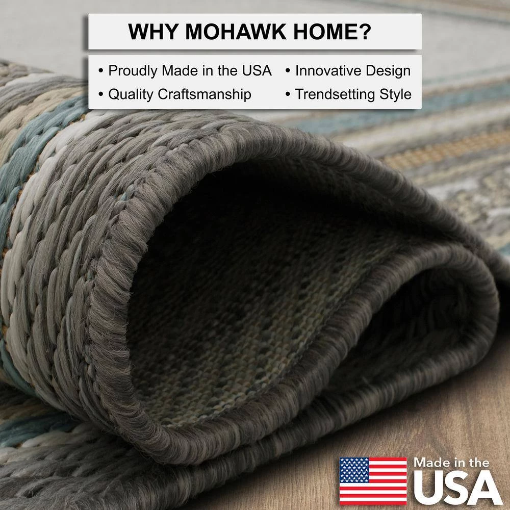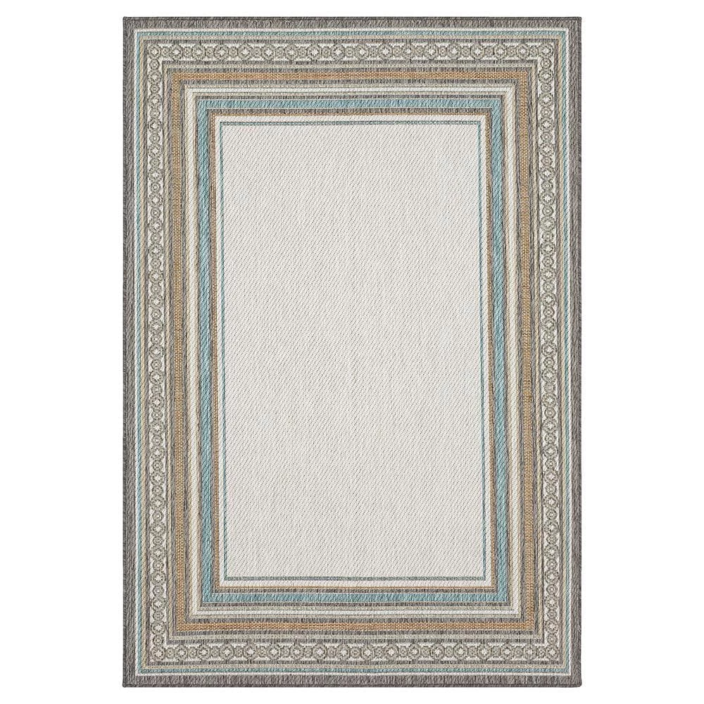 The Mohawk Home Seaside Border Light Grey Area Rug features a geometric inspired design with a timeless framed border in a rich color palette of cream, grey, light blue and brown. These flatwoven area rugs are made from weather-resistant polypropylene yarn, offering the perfect balance of soft feel and dependable durability with moisture, stain and fade resistance. Beautiful both inside and outside, this luxuriously versatile collection can be placed indoors or in outdoor spaces making them equally as stunning on your patio as they are in your living room. An ideal choice for any high traffic area and households with kids and pets. Available in popular sizes such as 5 ft. x 8 ft. and 8 ft. x 10 in. this area rug is a great choice for adding style to a variety of spaces in your home.