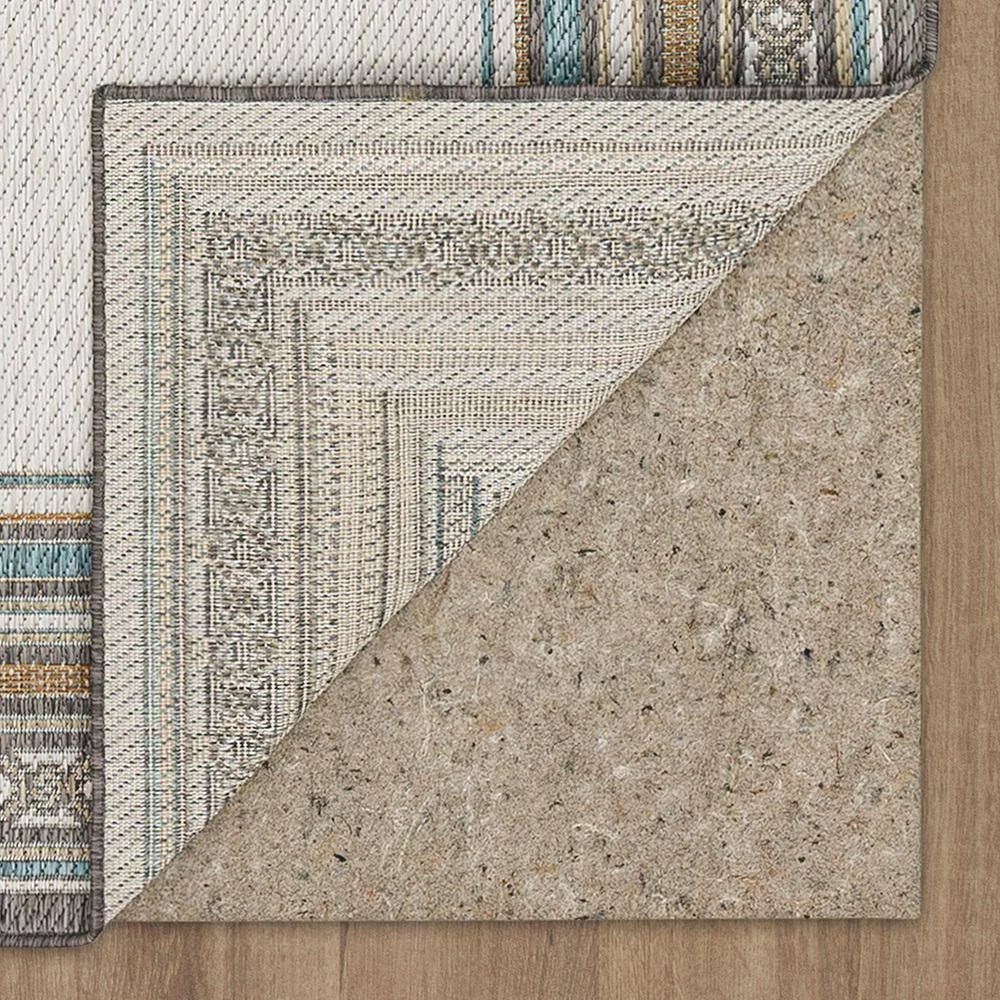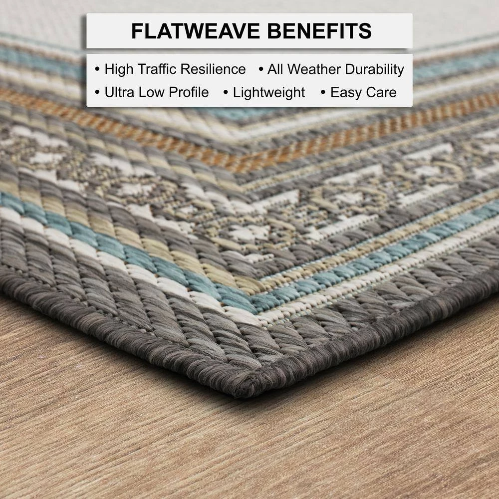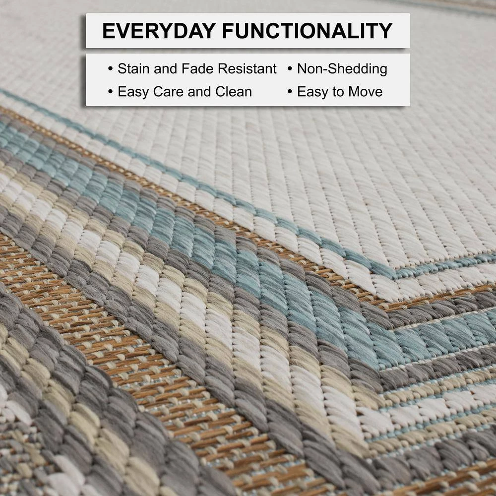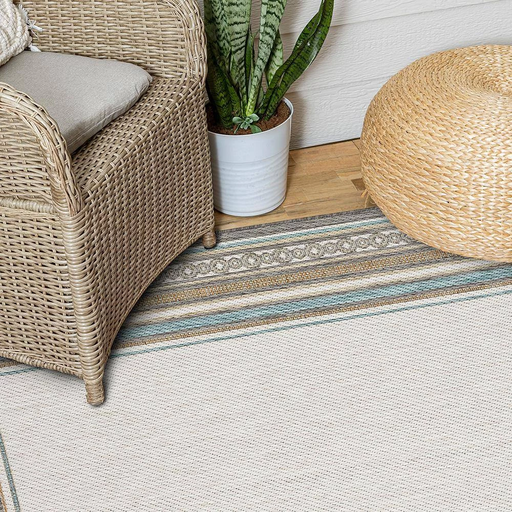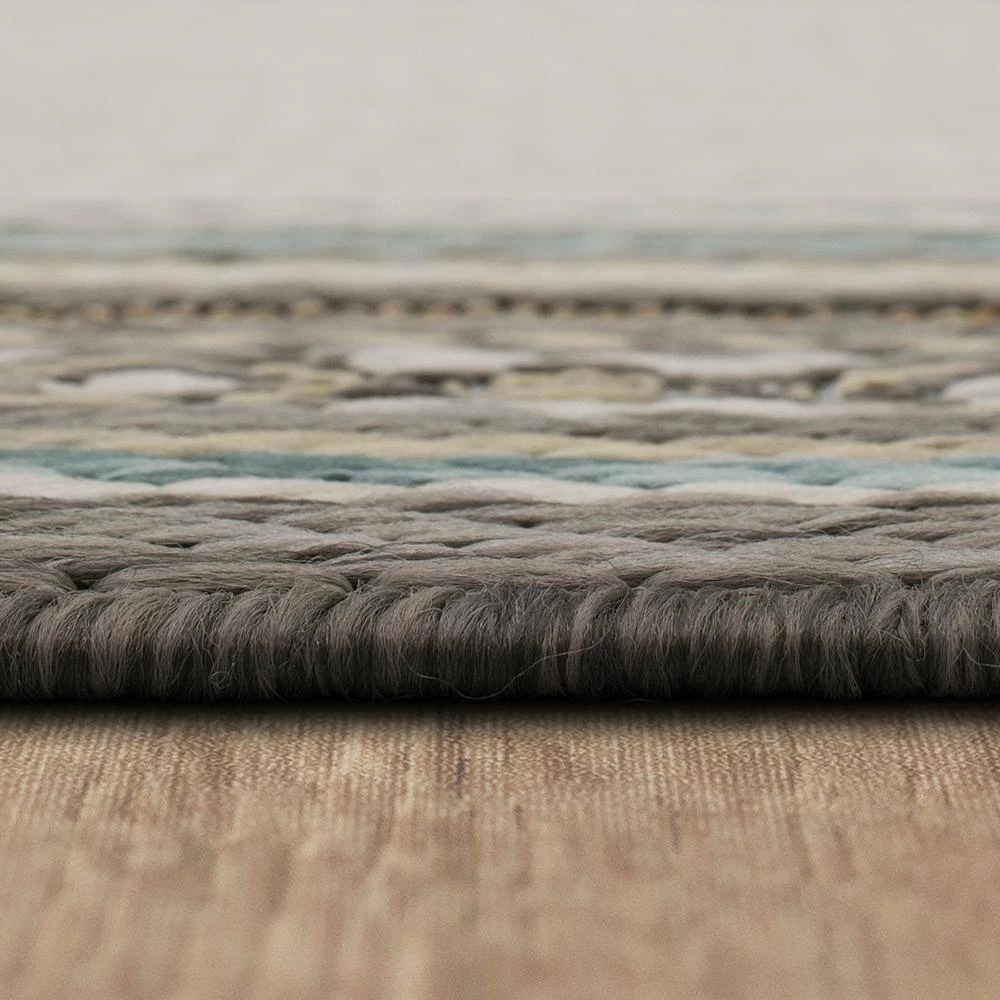 The Mohawk Home Seaside Border Light Grey Area Rug features a geometric inspired design with a timeless framed border in a rich color palette of cream, grey, light blue and brown. These flatwoven area rugs are made from weather-resistant polypropylene yarn, offering the perfect balance of soft feel and dependable durability with moisture, stain and fade resistance. Beautiful both inside and outside, this luxuriously versatile collection can be placed indoors or in outdoor spaces making them equally as stunning on your patio as they are in your living room. An ideal choice for any high traffic area and households with kids and pets. Available in popular sizes such as 5 ft. x 8 ft. and 8 ft. x 10 in. this area rug is a great choice for adding style to a variety of spaces in your home.