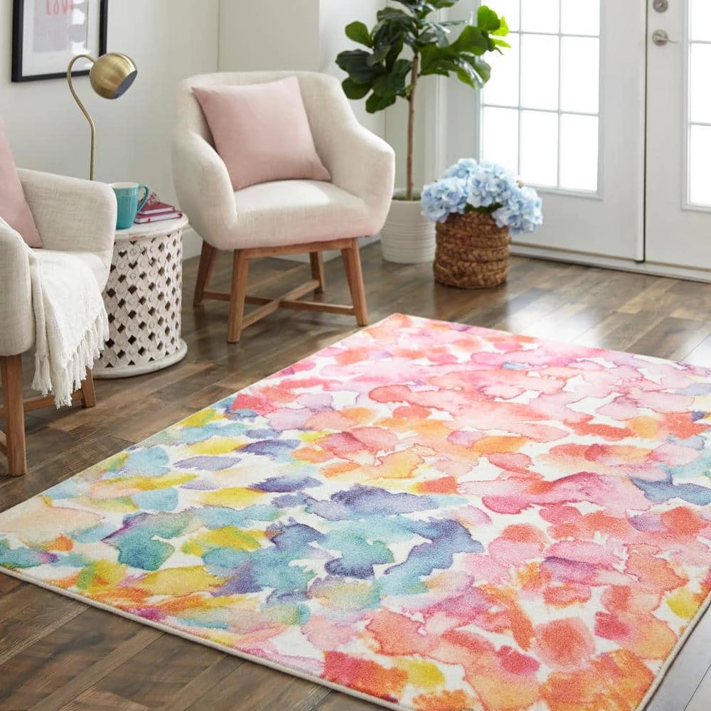 Abstract watercolor blossoms bloom in contemporary colors of pink, aqua, red, orange and yellow in the floral inspired style of Mohawk Homes Sunwashed Dream Area Rug in Multicolor. When it comes to color, the sky is no longer the limit with the infinite possibilities of Mohawk Homes revolutionary Prismatic Collection. Thoughtfully crafted in small batches utilizing Mohawk Homes exclusive Precision Dye Injected Printer, the Prismatic Collection is redefining printed rugs, literally one original design at a time. Designed on a plush EverStrand woven base, each style in this collection features superior strength stain resistance and a cozy soft touch. Consciously created with EverStrand yarn, Mohawk Homes exclusive premium recycled polyester produced from post-consumer plastic water bottles, this collection offers environmentally friendly options that are as easy on the eyes as they are the world around us.