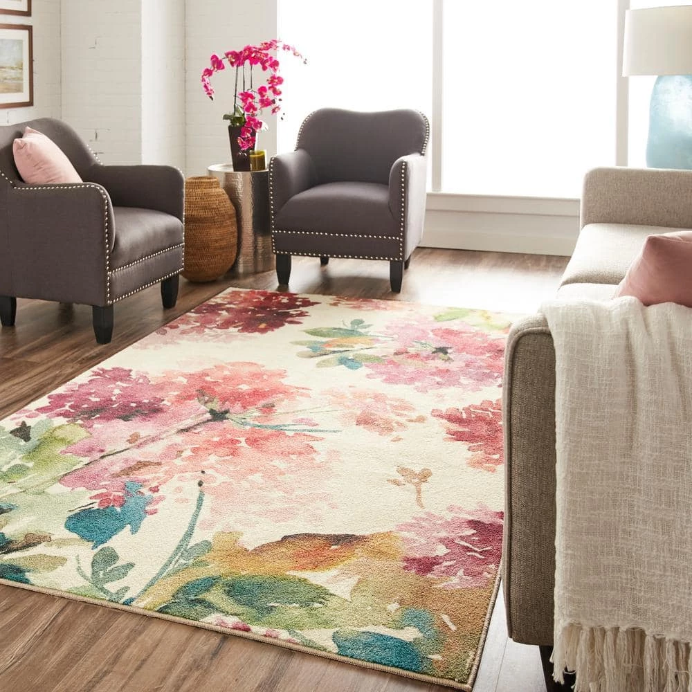 Delicate petals dazzle in a rich, overdyed multicolor palette in the modern painterly inspired floral motif of Mohawk Homes Watercolor Garden Area Rug. Pink, magenta, purple, red, green and tan colors blend together beautifully over this enchanting nature inspired style. When it comes to color, the sky is no longer the limit with the infinite possibilities of Mohawk Homes revolutionary Prismatic Collection. Thoughtfully crafted in small batches utilizing Mohawk Homes exclusive Precision Dye Injected Printer, the Prismatic Collection is redefining printed rugs, literally one original design at a time. Each style in this collection features superior strength, stain resistance, and a cozy soft touch. Consciously created with EverStrand yarn, Mohawk Homes exclusive premium recycled polyester produced from post-consumer plastic water bottles, this collection offers environmentally friendly options that are as easy on the eyes as they are the world around us.